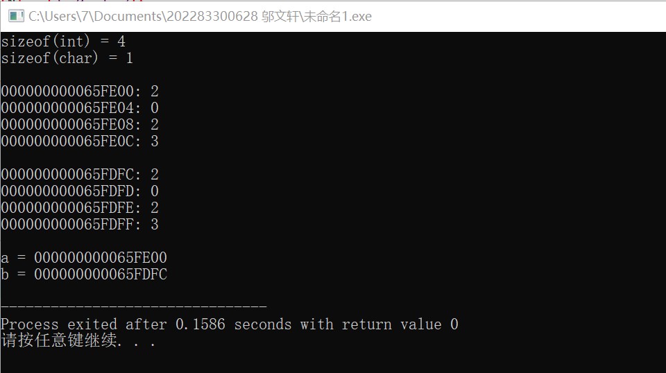 #include <stdio.h> #define N 4 int main() { int a[N] = {2, 0, 2, 3}; char b[N] = {'2', '0', '2', '3'}; int i; printf("sizeof(int) = %d\n", sizeof(int)); printf("sizeof(char) = %d\n", sizeof(char)); printf("\n"); // 输出int型数组a中每个元素的地址、值 for (i = 0; i < N; ++i) printf("%p: %d\n", &a[i], a[i]); printf("\n"); // 输出char型数组b中每个元素的地址、值 for (i = 0; i < N; ++i) printf("%p: %c\n", &b[i], b[i]); printf("\n"); // 输出数组名a和b对应的值 printf("a = %p\n", a); printf("b = %p\n", b); return 0; }