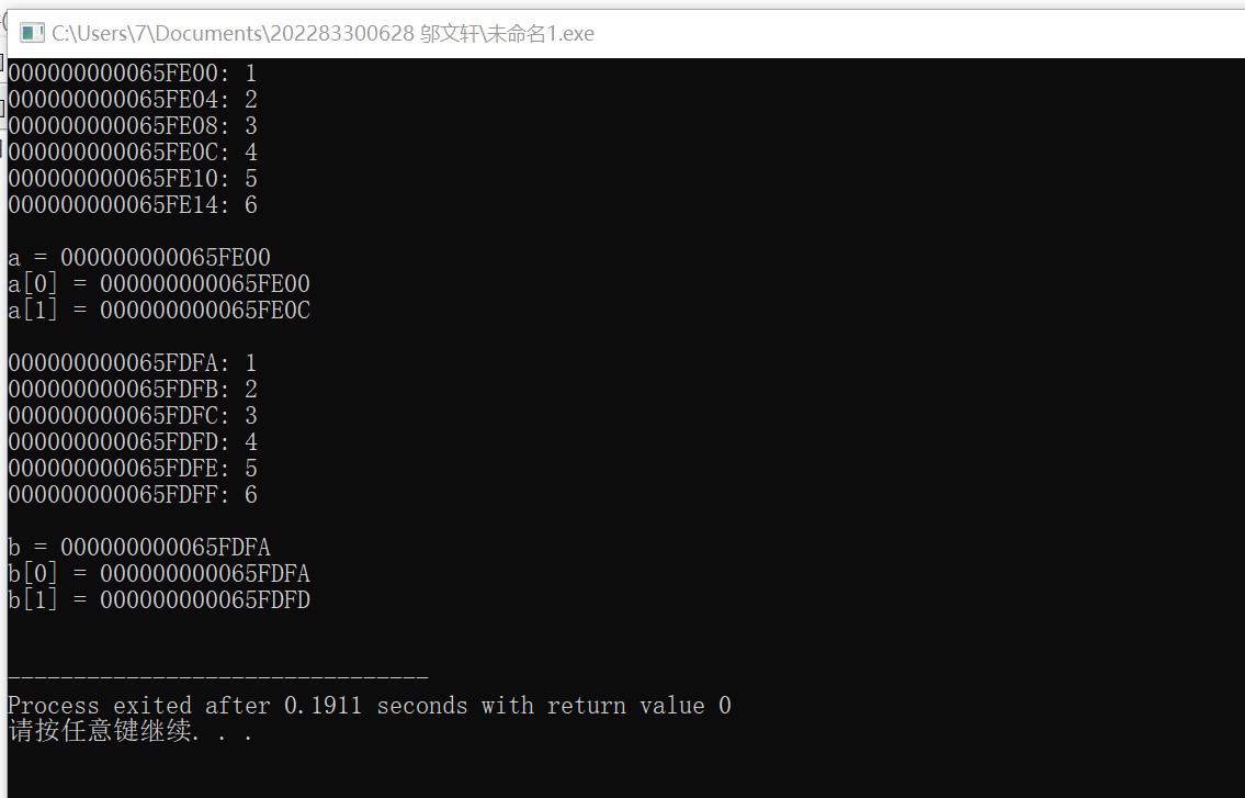 #include <stdio.h> #define N 2 #define M 3 int main() { int a[N][M] = {{1, 2, 3}, {4, 5, 6}}; char b[N][M] = {{'1', '2', '3'}, {'4', '5', '6'}}; int i, j; // 输出int型二维数组a中每个元素的地址、值 for (i = 0; i < N; ++i) for (j = 0; j < M; ++j) printf("%p: %d\n", &a[i][j], a[i][j]); printf("\n"); // 输出int型二维数组名a, 以及,a[0], a[1]的值 printf("a = %p\n", a); printf("a[0] = %p\n", a[0]); printf("a[1] = %p\n", a[1]); printf("\n"); // 输出char型二维数组b中每个元素的地址、值 for (i = 0; i < N; ++i) for (j = 0; j < M; ++j) printf("%p: %c\n", &b[i][j], b[i][j]); printf("\n"); // 输出char型二维数组名b, 以及,b[0], b[1]的值 printf("b = %p\n", b); printf("b[0] = %p\n", b[0]); printf("b[1] = %p\n", b[1]); printf("\n"); return 0; }