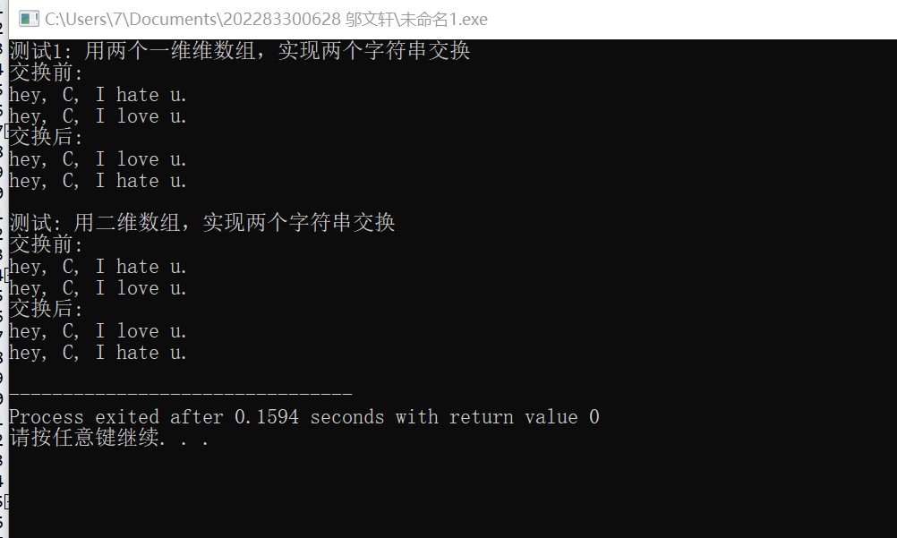 #include <stdio.h> #include <string.h> #define N 80 void swap_str(char s1[N], char s2[N]); void test1(); void test2(); int main() { printf("测试1: 用两个一维维数组,实现两个字符串交换\n"); test1(); printf("\n测试: 用二维数组,实现两个字符串交换\n"); test2(); return 0; } void test1() { char views1[N] = "hey, C, I hate u."; char views2[N] = "hey, C, I love u."; printf("交换前: \n"); puts(views1); puts(views2); swap_str(views1, views2); printf("交换后: \n"); puts(views1); puts(views2); } void test2() { char views[2][N] = {"hey, C, I hate u.", "hey, C, I love u."}; printf("交换前: \n"); puts(views[0]); puts(views[1]); swap_str(views[0], views[1]); printf("交换后: \n"); puts(views[0]); puts(views[1]); } void swap_str(char s1[N], char s2[N]) { char tmp[N]; strcpy(tmp, s1); strcpy(s1, s2); strcpy(s2, tmp); }