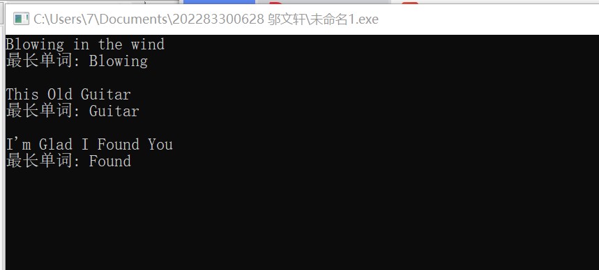 /* 输入一行英文文本,统计最长单词,并打印输出。 为简化问题,只考虑单词之间用空格间隔的情形。 相较于教材例5.24,做了以下改动: 1. 增加了多组输入,因此,一些变量初始化放到了第一层循环里面 2. 微调了代码书写逻辑和顺序 */ #include <stdio.h> #define N 1000 int main() { char line[N]; int word_len; // 记录当前单词长度 int max_len; // 记录最长单词长度 int end; // 记录最长单词结束位置 int i; while(gets(line) != NULL) { word_len = 0; max_len = 0; end = 0; i = 0; while(1) { // 跳过连续空格 while(line[i] == ' ') { word_len = 0; // 单词长度置0,为新单词统计做准备 i++; } // 在一个单词中,统计当前单词长度 while(line[i] != '\0' && line[i] != ' ') { word_len++; i++; } // 更新更长单词长度,并,记录最长单词结束位置 if(max_len < word_len) { max_len = word_len; end = i; // end保存的是单词结束的下一个坐标位置 } // 遍历到文本结束时,终止循环 if(line[i] == '\0') break; } // 输出最长单词 printf("最长单词: "); for(i = end - max_len; i < end; ++i) printf("%c", line[i]); printf("\n\n"); } return 0; }