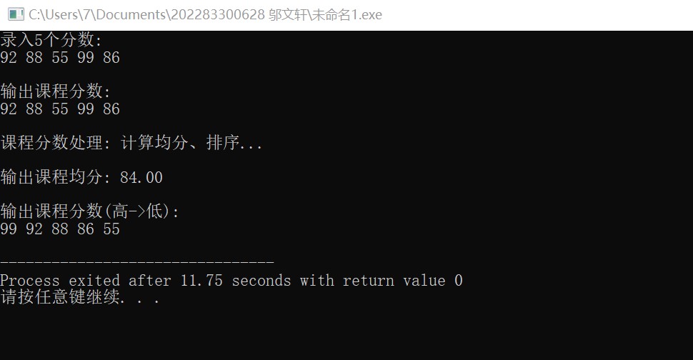 #include <stdio.h> #define N 5 void input(int x[], int n); void output(int x[], int n); double average(int x[], int n); void bubble_sort(int x[], int n); int main() { int scores[N]; double ave; printf("录入%d个分数:\n", N); input(scores, N); printf("\n输出课程分数: \n"); output(scores, N); printf("\n课程分数处理: 计算均分、排序...\n"); ave = average(scores, N); bubble_sort(scores, N); printf("\n输出课程均分: %.2f\n", ave); printf("\n输出课程分数(高->低):\n"); output(scores, N); return 0; } void input(int x[], int n) { int i; for(i = 0; i < n; ++i) scanf("%d", &x[i]); } void output(int x[], int n) { int i; for(i = 0; i < n; ++i) printf("%d ", x[i]); printf("\n"); } double average(int x[], int n){ double a=0; int i; for(i = 0;i < n;i++) a+=x[i]; return a/n; } void bubble_sort(int x[], int n){ int i,j,t; for(i=0;i<n-1;i++) for(j=0;j<n-1-i;j++) if(x[j]<x[j+1]){ t=x[j]; x[j]=x[j+1]; x[j+1]=t; } }
