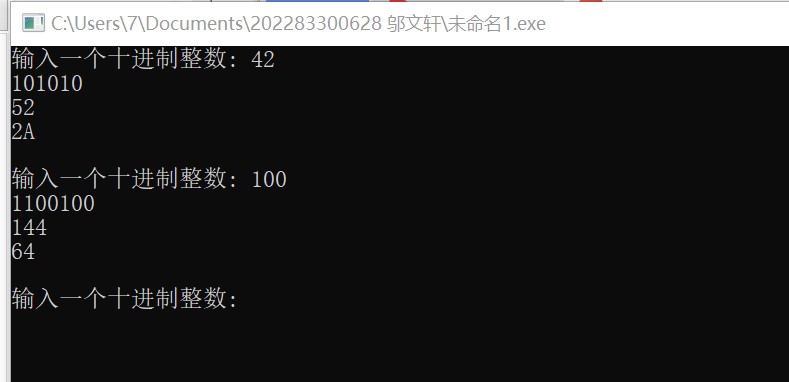 #include <stdio.h> #define N 100 void dec2n(int x, int n); int main() { int x; printf("输入一个十进制整数: "); while(scanf("%d", &x) != EOF) { dec2n(x, 2); dec2n(x, 8); dec2n(x, 16); printf("\n输入一个十进制整数: "); } return 0; } void dec2n(int x, int n){ char a[100]; int i=0,j=0; while(x>=n){ if(x%n<=9) a[j++]=x%n+48; else a[j++]=x%n-10+'A'; x/=n; } if(x<=9) a[j]=x+'0'; else a[j]=x-10+'A'; for(i=j;i>=0;i--) { printf("%c",a[i]); } printf("\n"); }