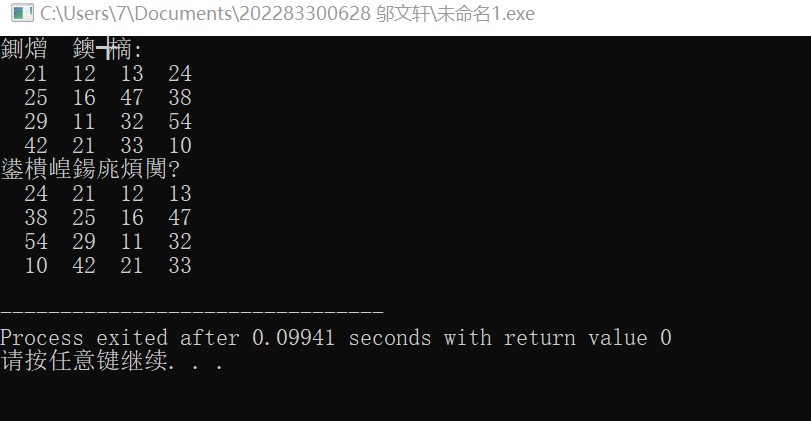 #include<stdio.h> #define N 100 #define M 4 void output(int x[][N],int n); void rotate_to_right(int x[][N],int n); int main(){ int t[][N]={{21,12,13,24}, {25,16,47,38}, {29,11,32,54}, {42,21,33,10}}; printf("原始矩阵:\n"); output(t,M); printf("变换后矩阵:\n"); rotate_to_right(t,M); return 0; } void output(int x[][N],int n){ int i,j; for(i=0;i<n;++i){ for(j=0;j<n;++j) printf("%4d",x[i][j]); printf("\n");} } void rotate_to_right(int x[][N],int n){ int i,j; for(i=0;i<n;++i){ for(j=0;j<n;++j) if(j==0) printf("%4d",x[i][n-1]); else printf("%4d",x[i][j-1]); printf("\n"); } }