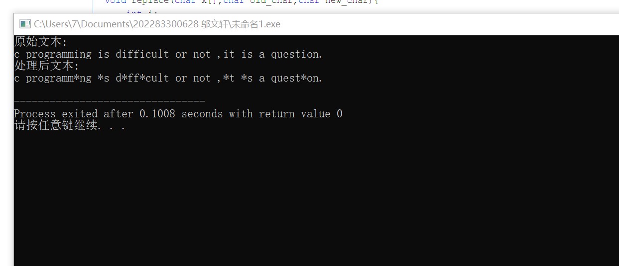 #include<stdio.h> #define N 80 void replace(char x[],char old_char,char new_char); int main(){ char text[N]="c programming is difficult or not ,it is a question."; printf("原始文本:\n"); printf("%s\n",text); replace(text,'i','*'); printf("处理后文本:\n"); printf("%s\n",text); return 0; } void replace(char x[],char old_char,char new_char){ int i; for(i=0;x[i]!='\0';++i) if(x[i]==old_char) x[i]=new_char; }