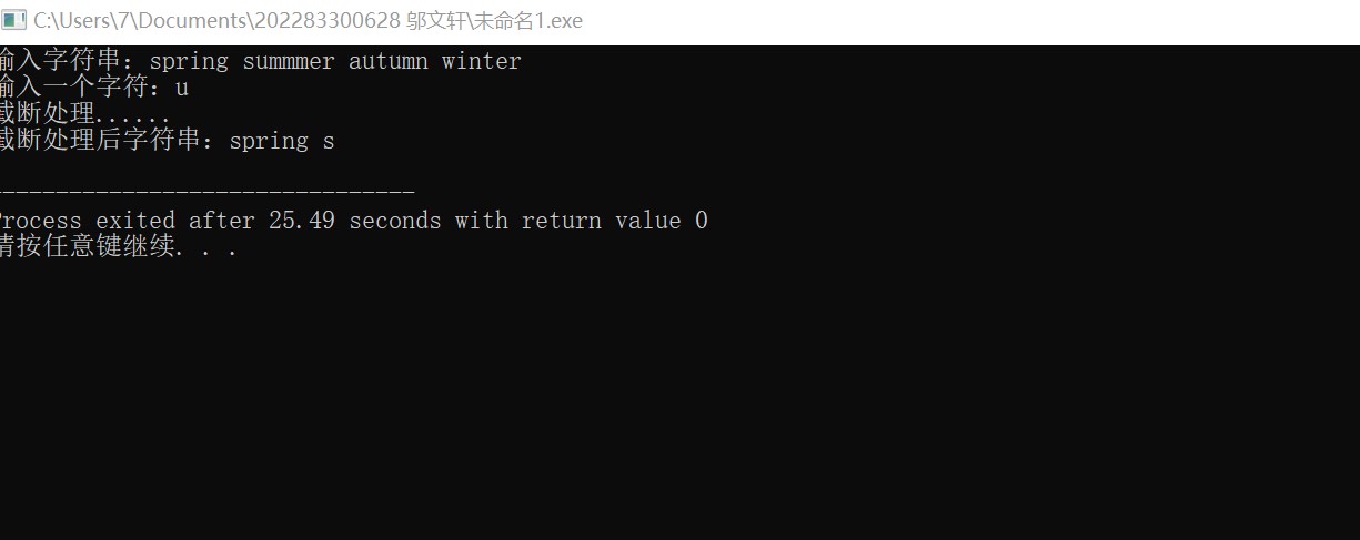 #include<stdio.h> #define N 80 int main(){ char str[N],ch; int i; printf("输入字符串:") ; gets(str) ; printf("输入一个字符:"); ch=getchar(); printf("截断处理......"); i=0; while(str[i]!='\0'){ if(str[i]==ch) break; i++;} str[i]='\0'; printf("\n截断处理后字符串:%s\n",str); return 0; }