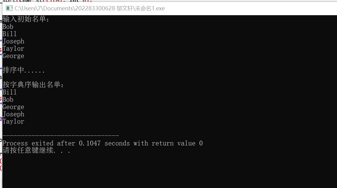 #include<stdio.h> #include<string.h> #define N 5 #define M 20 void bubble_sort(char str[][M], int n); int main(){ char name[][M]={"Bob","Bill","Joseph","Taylor","George"}; int i; printf("输入初始名单:\n"); for(i=0;i<N;i++) printf("%s\n",name[i]); printf("\n排序中......\n"); bubble_sort(name,N); printf("\n按字典序输出名单:\n"); for(i=0;i<N;i++) printf("%s\n",name[i]); return 0; } void bubble_sort(char str[][M],int n){ int j,i; char t[M]; for(i=0;i<n-1;i++){ for(j=0;j<n-1-i;j++) if(strcmp(str[j],str[j+1])>0){ strcpy(t,str[j]); strcpy(str[j],str[j+1]); strcpy(str[j+1],t); } } }