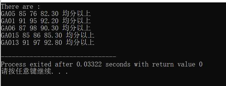 #include <stdio.h> #include<string.h> #define N 100 typedef struct { char num[10]; int s1; int s2; double sum; char level[10]; } STU; int fun(STU a[], int n, STU h[]); int main() { STU s[N]={ {"GA05", 85, 76}, {"GA03", 76, 90}, {"GA02", 69, 90}, {"GA04", 85, 56}, {"GA01", 91, 95}, {"GA07", 72, 80}, {"GA08", 64, 45}, {"GA06", 87, 98}, {"GA015", 85, 86}, {"GA013", 91, 97} }; STU h[N]; int i, k, n = 10; k = fun(s, n, h); printf("There are :\n"); for(i = 0; i < k; i++) printf("%s %d %d %.2f %s\n", h[i].num, h[i].s1, h[i].s2, h[i].sum, h[i].level); return 0; } int fun (STU a[], int n, STU h[]) { int i,j=0; double sum=0; double s=0; for (i=0;i<n;i++){ a[i].sum=a[i].s1*0.7+a[i].s2*0.3; s+=a[i].sum; } s=s/n; for (i=0;i<n;i++){ if (a[i].s1*0.7+a[i].s2*0.3>=s){ strcpy(a[i].level,"均分以上"); h[j++]=a[i]; } } return j; }