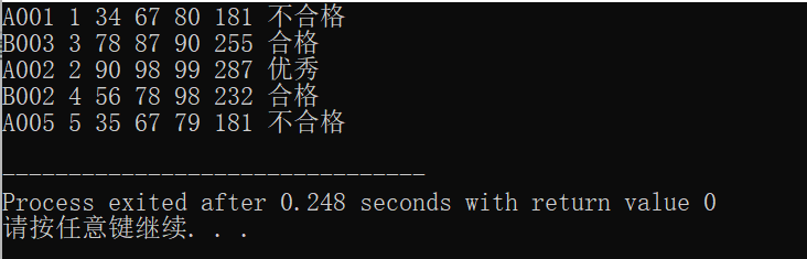 #include <stdio.h> #include <string.h> #define N 5 typedef struct student { char name[10]; int num; int maths; int computer; int english; int sum; char level[10]; } STU; void fun(STU a[], int n); int main() { STU s[6*N]={ {"A001", 1, 34, 67, 80}, {"B003", 3, 78, 87, 90}, {"A002", 2, 90, 98, 99}, {"B002", 4, 56, 78, 98}, {"A005", 5, 35, 67, 79} }; int i; fun(s, N); for(i = 0; i < N; i++) printf("%s %d %d %d %d %d %s\n", s[i].name, s[i].num, s[i].maths, s[i].computer, s[i].english, s[i].sum, s[i].level); return 0; } void fun(STU a[], int n) { int i=0; int max=0,min=300,s=0; for (i=0;i<n;i++){ a[i].sum=a[i].maths+a[i].computer+a[i].english; if (a[i].sum>max) max=a[i].sum; if (a[i].sum<min) min=a[i].sum; } for (i=0;i<n;i++){ if (a[i].sum==max) strcpy(a[i].level,"优秀"); else if (a[i].sum==min) strcpy(a[i].level,"不合格"); else strcpy(a[i].level,"合格"); } }