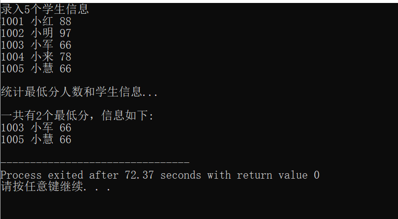 #include <stdio.h> #define N 5 typedef struct student { long no; char name[20]; int score; } STU; void input(STU s[], int n); int find_min_list(STU s[], STU t[], int n); void output(STU s[], int n); int main() { STU stu[N], min_list[N]; int count; printf("录入%d个学生信息\n", N); input(stu, N); printf("\n统计最低分人数和学生信息...\n"); count = find_min_list(stu, min_list, N); printf("\n一共有%d个最低分,信息如下:\n", count); output(min_list, count); return 0; } void input(STU s[], int n) { int i=0; for (i=0;i<n;i++) scanf("%ld %s %d", &s[i].no,&s[i].name,&s[i].score); } void output(STU s[], int n) { int i=0; for (i=0;i<n;i++) printf("%ld %s %d\n", s[i].no,s[i].name,s[i].score); } int find_min_list(STU s[], STU t[], int n) { int i=0; int j=0; int min=s[0].score; for (i=0;i<n;i++) if (s[i].score<min) min=s[i].score; for (i=0;i<n;i++) if (s[i].score==min) t[j++]=s[i]; return j; }