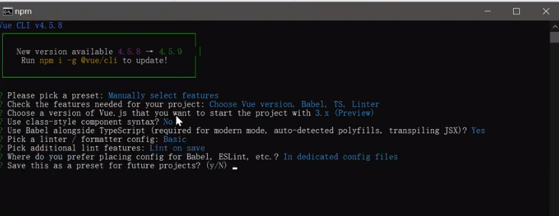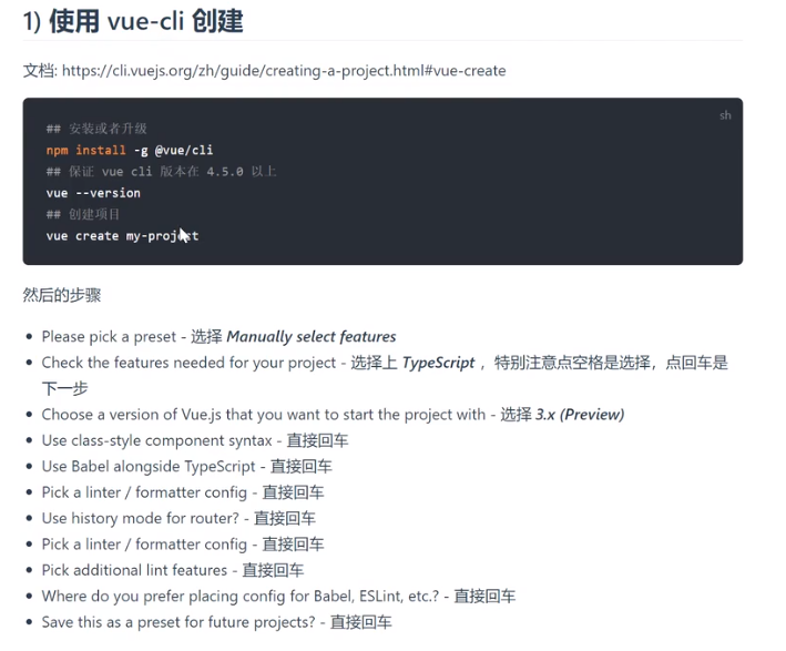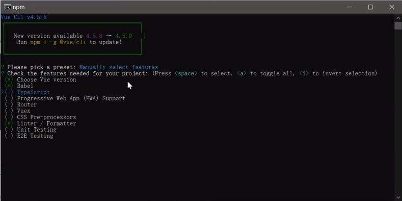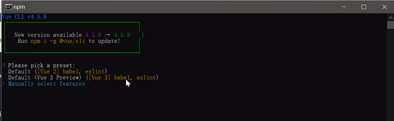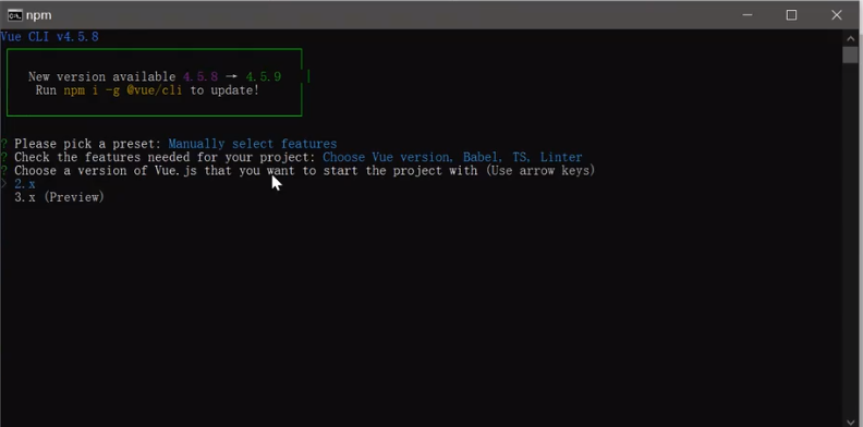 首先就不要看vue2 了,直接看vue3,如果不需要ts(TypeScript)就默认安装vue3,否则选Manually select features(即自选配置)