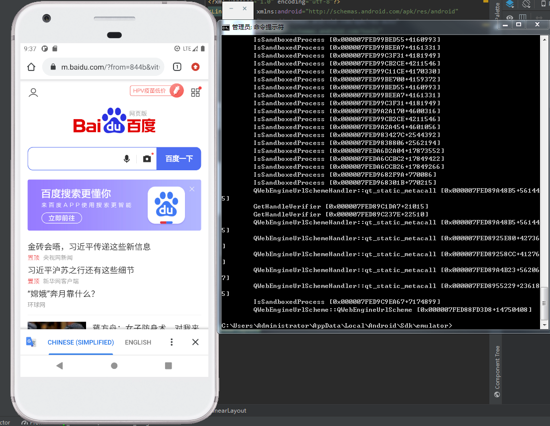 上述是方法,需要注意的是CMD命令时,需先关闭AVD,执行emmuator.exe时自启AVD,并在CMD命令那里显示执行的信息,如图所示: