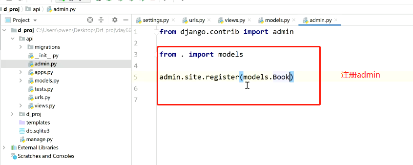 2)在admin.py中注册Model类,方便在后台(admin)可视化管理数据