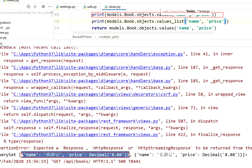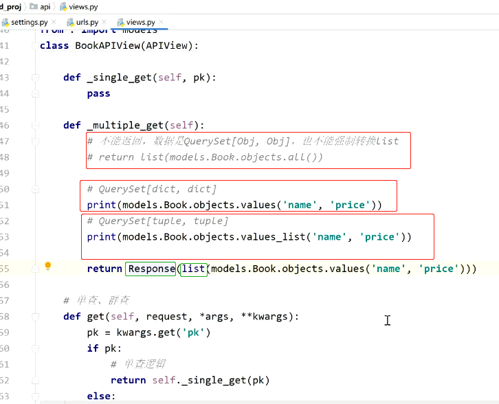 from rest_framework.views import APIView from rest_framework.response import Response from . import models class BookAPIView(APIView): def _multiple_get(self): # 不能返回,数据是QuerySet[Obj, Obj],也不能强制转换list # return list(models.Book.objects.all()) # QuerySet[dict, dict] # print(models.Book.objects.values('name', 'price')) # QuerySet[tuple, tuple] # print(models.Book.objects.values_list('name', 'price')) return Response(list(models.Book.objects.values('name', 'price'))) def _single_get(self, pk): # return Response(models.Book.objects.filter(pk=pk).values('name', 'price').first()) # 开发阶段建议能用try的地方,不要使用if判断 try: return Response(models.Book.objects.values('name', 'price').get(pk=pk)) except: return Response('资源不存在') # 单查、群查 def get(self, request, *args, **kwargs): pk = kwargs.get('pk') if pk: # 单查逻辑 return self._single_get(pk) else: # 群查逻辑 return self._multiple_get()