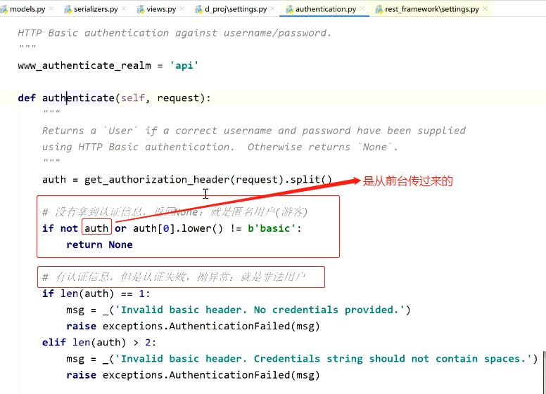 没有认证信息,返回None:匿名用户(游客) => 匿名用户request.user也有值,就是"匿名对象(Anonymous)"