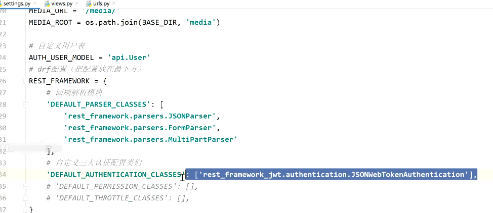 3)我们一般不需要自定义认证类,在settings中全局配置第三方 jwt 认证组件提供的认证类即可