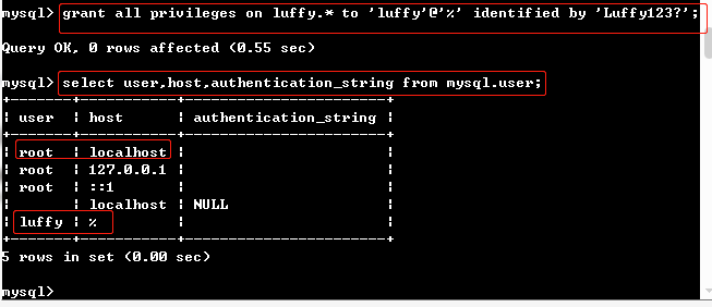 >: grant all privileges on luffy.* to 'luffy'@'%' identified by 'Luffy123?';