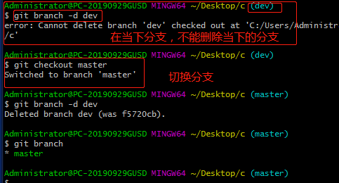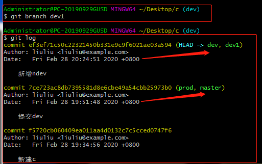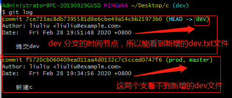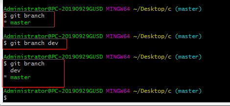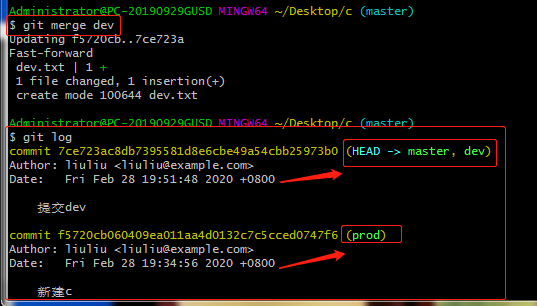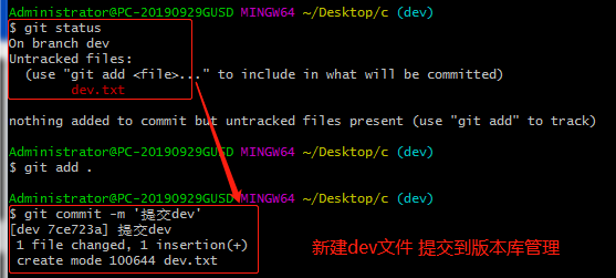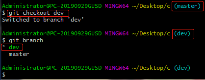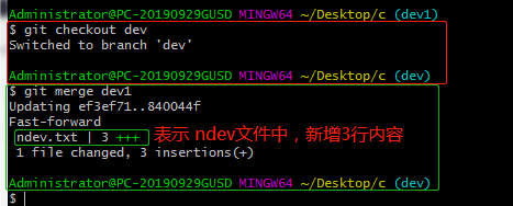 把dev分支合并到master分支:切换到master分支,执行合并dev分支的命令