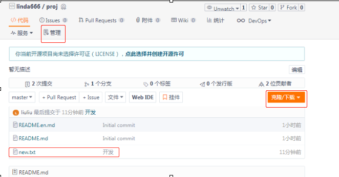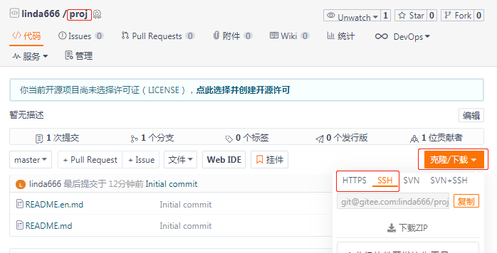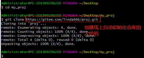 本地新建一个空文件夹(my_proj),克隆自动在线上初始化的仓库(点击进去仓库)