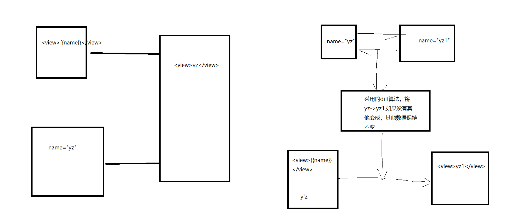 3 当有数据变化的时候,逻辑层负责更新数据,js对象发生改变,这种改变方式采用的是diff算法进行比较,只改变,变化的部分