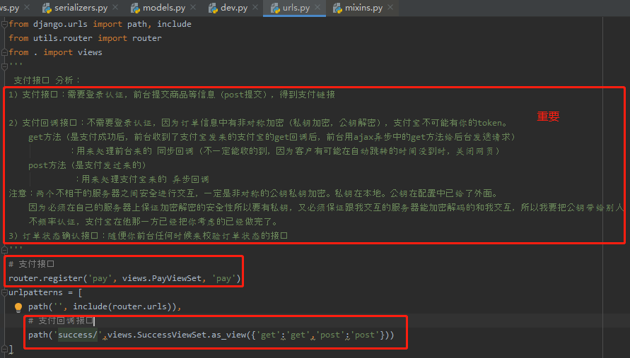 # 支付成功(支付回调)视图类 class SuccessViewSet(ViewSet): authentication_classes = () permission_classes = () # 支付宝同步回调给前台,在同步通知给后台处理 def get(self,request,*args,**kwargs): pass # 支付宝异步回调给后台 def post(self,request,*args,**kwargs): pass