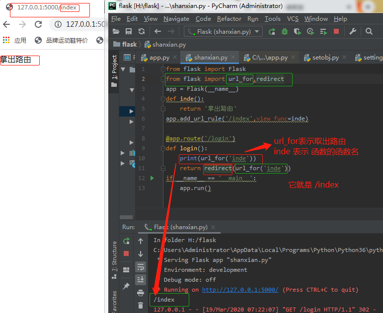 # 3 使用:@app.route('/index/<regex("\d+"):nid>') 正则表达式会当作第二个参数传递到类中 # 正则匹配处理结果,要交给to_python,to_python函数可以对匹配处理结果做处理 @app.route('/index/<regex("\d+"):nid>') def index(nid): print("index",nid,type(nid)) print(url_for('index', nid='888')) 这数什么意思????? return 'Index' if __name__ == '__main__': app.run()