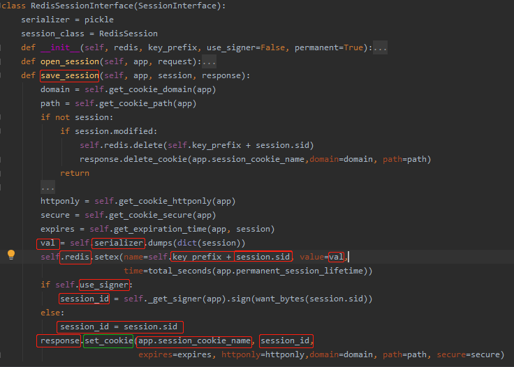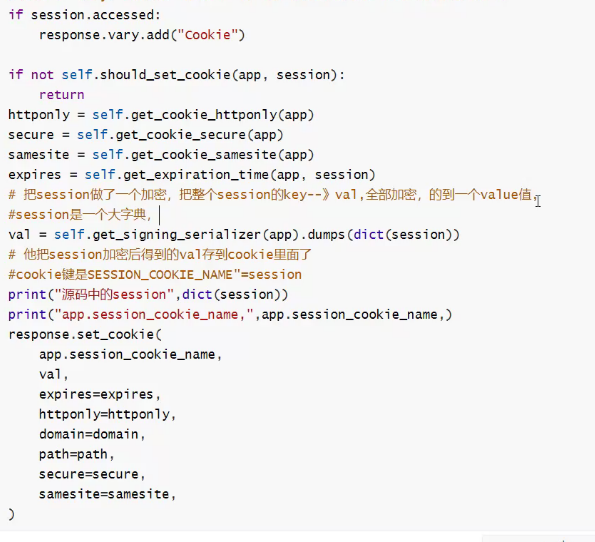 当响应要返回给客户端时候,会调用sesssion_interface中的save_session方法。把全局session字典做加密得到val,然后将这个val设置到cookie中。cookie的键为配置文件中的session_cookie_name,值就是我们session字典加密得到的结果。