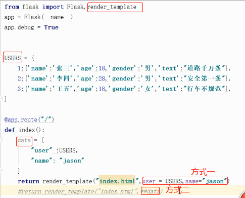 注意点:1 flask给模板传值,render_template("index.htm",user=user,name=name)