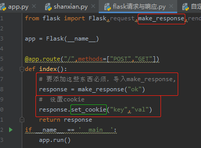 5.2 响应相关,把flask的四剑客传到make_response(四剑客),得到一个response对象,我们就可以对response设置请求头,设置cookie。