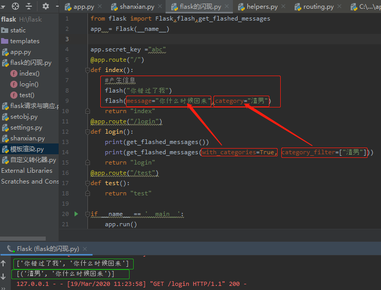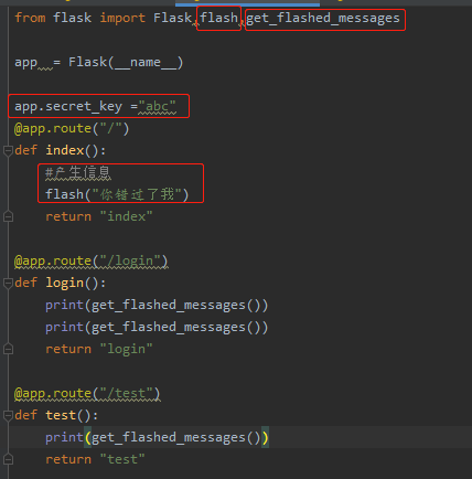 1 设置flash,必须设置app.secret_key="随便",因为flash是基于session的。
