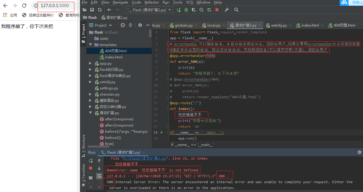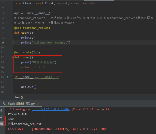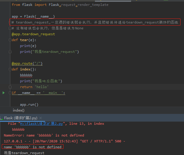 4、 teardown_request,一旦遇到错误就会执行,并且把错误传递给teardown_request装饰的函数。