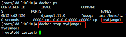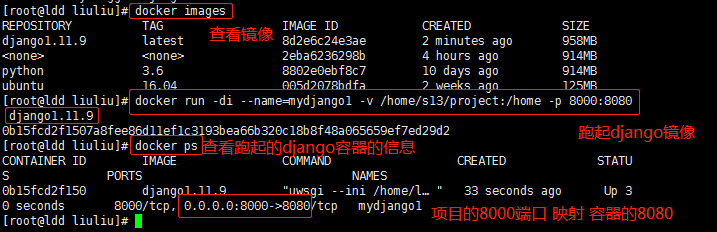 docker run -di --name=myproject -p 8000:8080 django1.11.9 做端口映射,进入容器