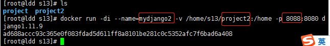 docker run -di --name=mydjango2 -v /home/s13/myproject2:/home -p 8088:8080 django1.11.9