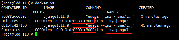 查看跑的容器,发现有两个 django容器,就是跑了两个项目。访问8000或8088都有项目。
