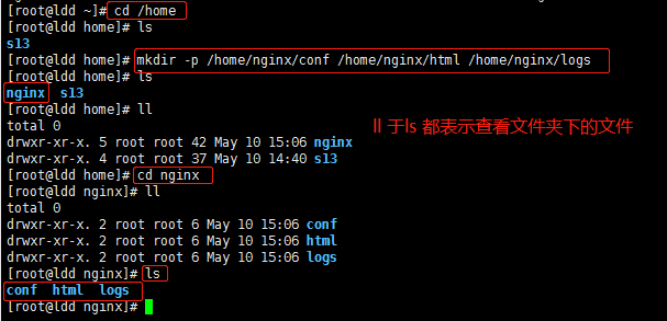 mkdir -p /home/nginx/conf /home/nginx/html /home/nginx/logs