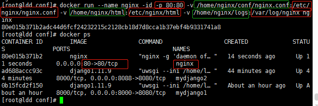docker run --name nginx -id -p 80:80 -v /home/nginx/conf/nginx.conf:/etc/nginx/nginx.conf -v /home/nginx/html:/etc/nginx/html -v /home/nginx/logs:/var/log/nginx nginx