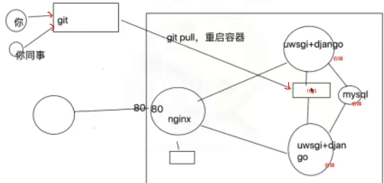 # 因为你django docker容器做了目录映射---》只需要修改代码,重启容器即可(git pull 即可)