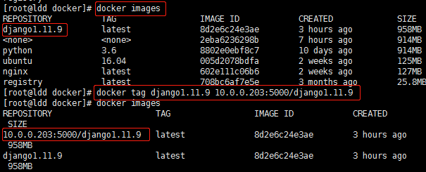 docker tag django1.11.9 10.0.0.203:5000/django1.11.9 django1.11.9 表示镜像的名字