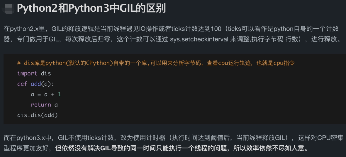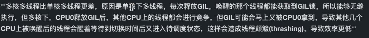 -同一时刻,实际上只有一条线程在执行,有一把全局锁,只要线程执行,必须获得这把锁,才能执行