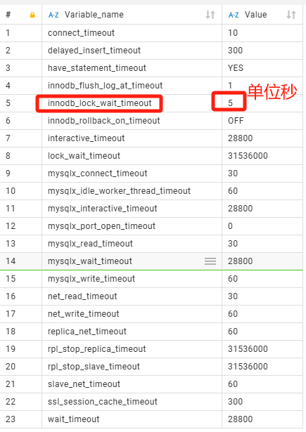 -- innodb_lock_wait_timeout 为锁等待超时时间,也是事务超时时间,可以手动设置