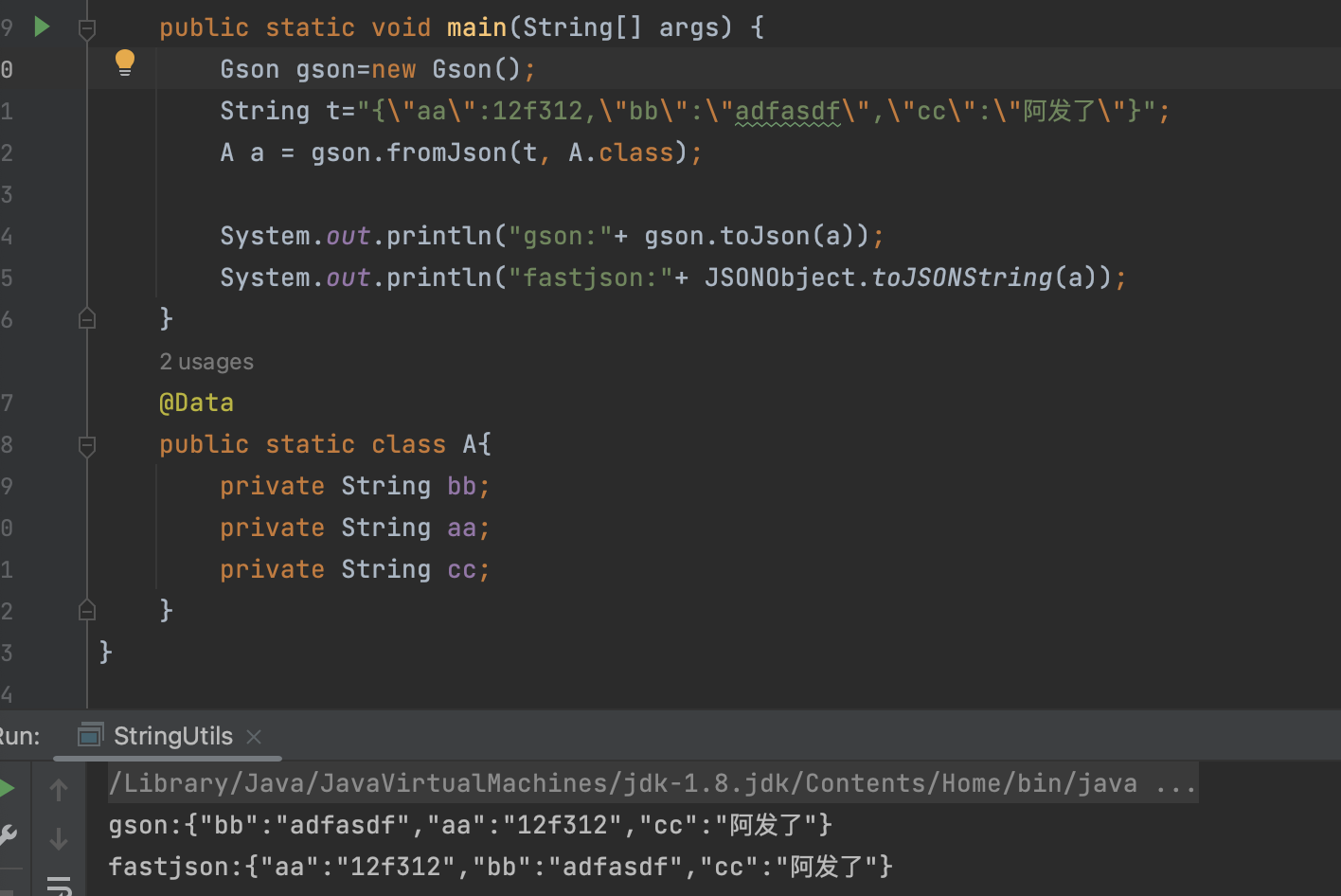 有时会发现json中字符串类型的value值没有用引号包围住,这样普通的转化实体,比如用fastjson这种就会出错,这时可以用gson