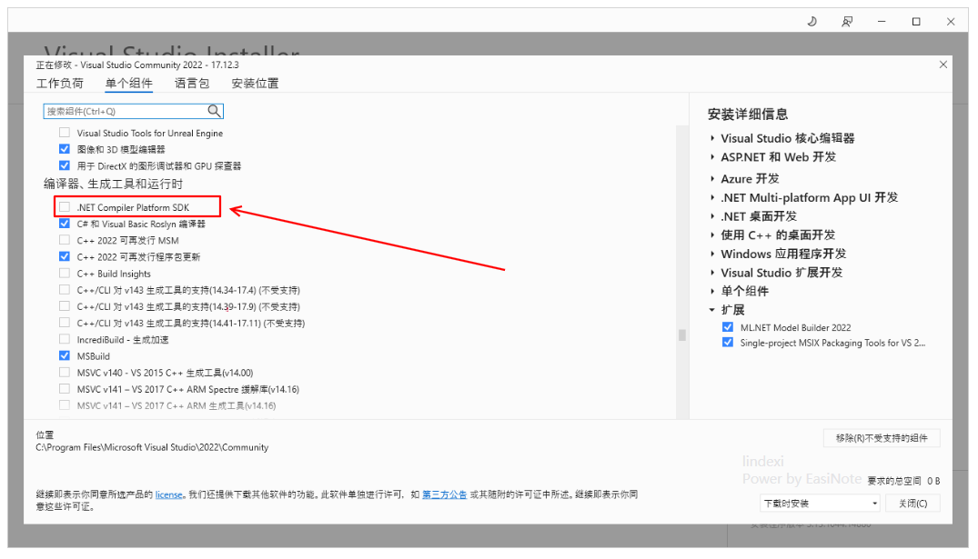 - 选中“.NET Compiler Platform SDK”框。 将在可选组件最下面找到它