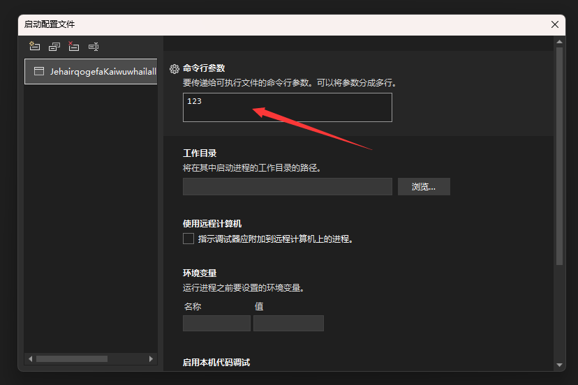 在打开的启动配置文件窗口里面,找个命令行参数,随便写入点字符。这个过程仅仅只是为了让 VisualStudio 帮助咱快速创建 launchSettings.json