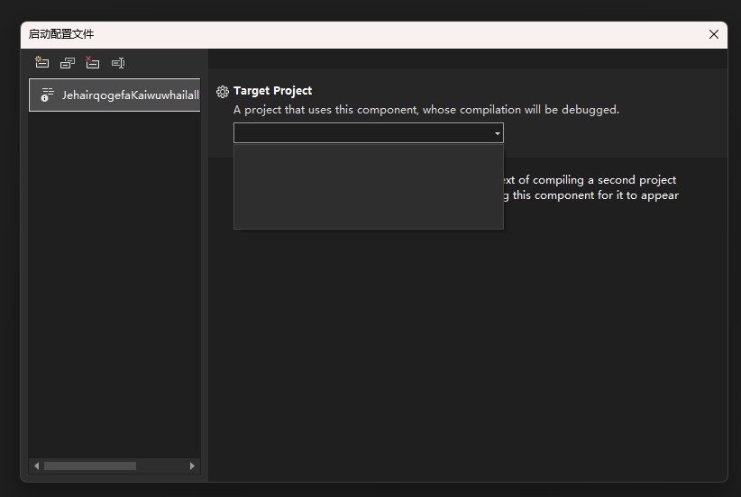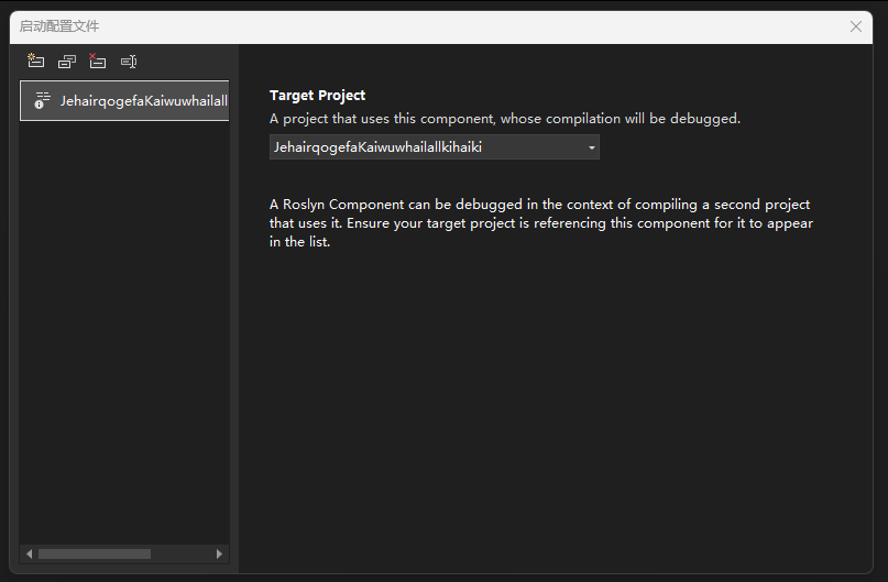 如果在打开的启动配置文件窗口里面,没有找到期望的调试项目,如下图所示,那么可能的原因就是期望的调试项目没有设置正确的分析器项目引用,即期望被调试的项目的 csproj 项目文件里面缺少如 <ProjectReference Include="你的分析器项目" OutputItemType="Analyzer" ReferenceOutputAssembly="false"/>