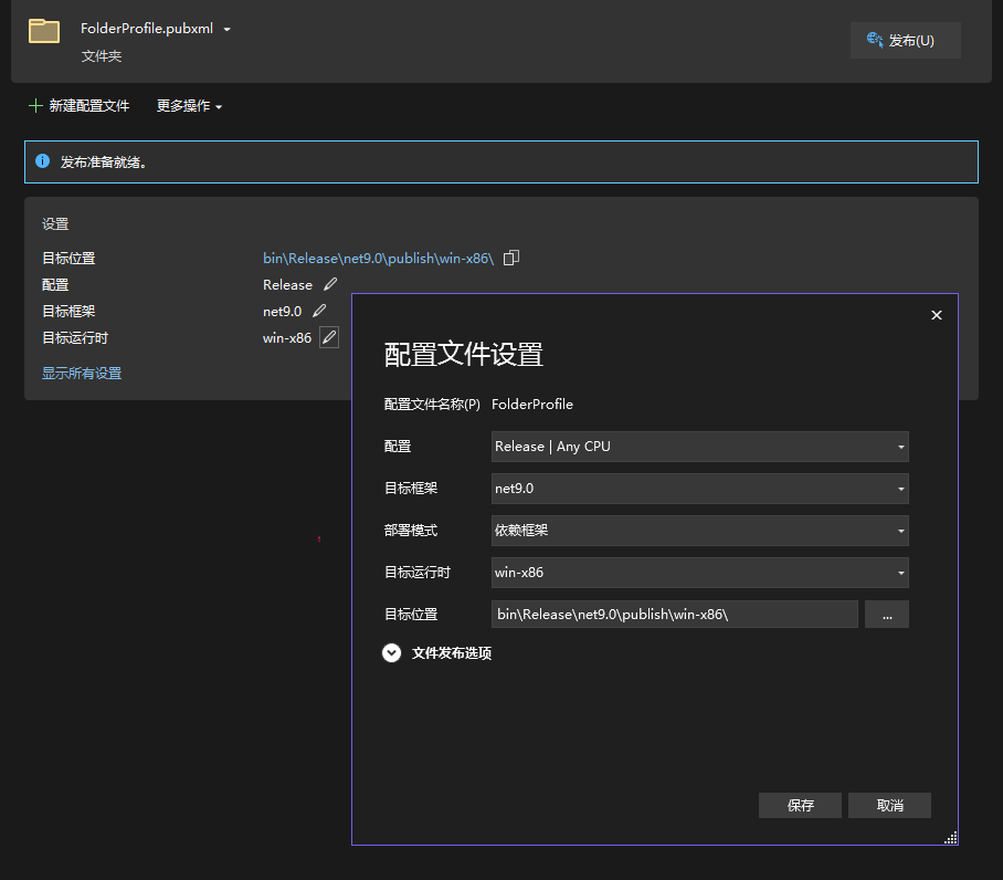 准备工作就此完成,接下来就是设置进行框架依赖发布。这里需要特别说明的是 .NET Core (包含 .NET 5 和更高版本)的输出 exe 是不能实现 .NET Framework 的 AnyCpu 魔法的,在使用自定义 dotnet 运行时路径时,需要根据自己的需求,明确指定其版本。这里也需要额外说明的是,尽管本文内容都在 Windows 下测试,但事实上本文介绍的 dotnet 这项新功能是可以在全平台使用的,即在 Linux 或 mac 上也适用