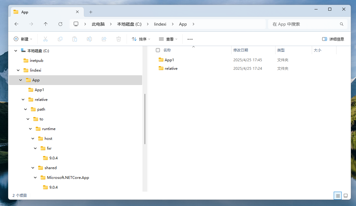 刚才在 AppHostRelativeDotNet 写的是相对于 ../relative/path/to/runtime 文件夹,嗯,这里只能写相对文件夹路径,不能写绝对文件夹路径。那咱就需要将发布输出的文件包装为里一层文件夹,我这里选择将其放入到名为 App1 的文件夹里面,这样我如果有第二个应用,就可以放入到 App2 文件夹里面