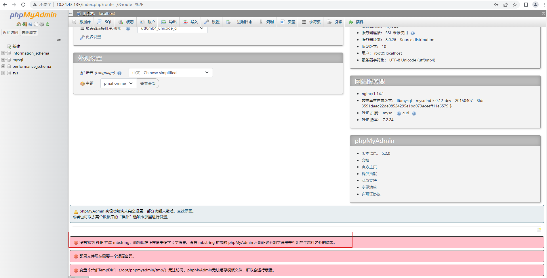 centos8 没有找到 PHP 扩展 mbstring,而您现在正在使用多字节字符集。没有 mbstring 扩展的 phpMyAdmin 不能正确分割字符串并可能产生意料之外的结果。