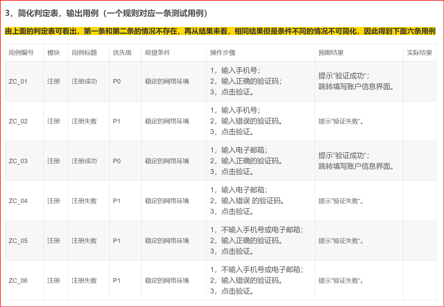 3,简化判定表,输出用例(一个规则对应一条测试用例)