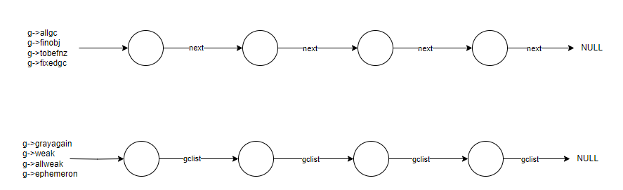 那么为啥其他的链表,比如 g->weak,g->grayagain 等这些链表不需要清除呢?答案是因为,这些链表其实只是标记阶段和原子阶段,辅助标记一些特殊对象,才临时存在的,用的是对象的 gclist 字段串连起来构成链表的,而且对象只会被其中的某个链表引用,因为 gclist 字段只有一个。新创建的可回收对象,仔细观察,会发现对象,只能在 g->allgc、g->fixedgc、g->finobj、g->tobefnz 这四个链表中的一处存在,通过 next 字段串连。
