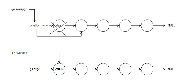如果啥也不管, g->sweepgc 直接就指向链表的第一个对象,那也不行,因为如果第一个对象是死的呢,g->sweepgc 和 g->allgc 同时指向这个对象,在 GCSswpallgc 阶段调用 sweepstep() 就会把第一个对象给 free 掉了,那 g->allgc 就指向一个死亡的对象了,就会有问题。