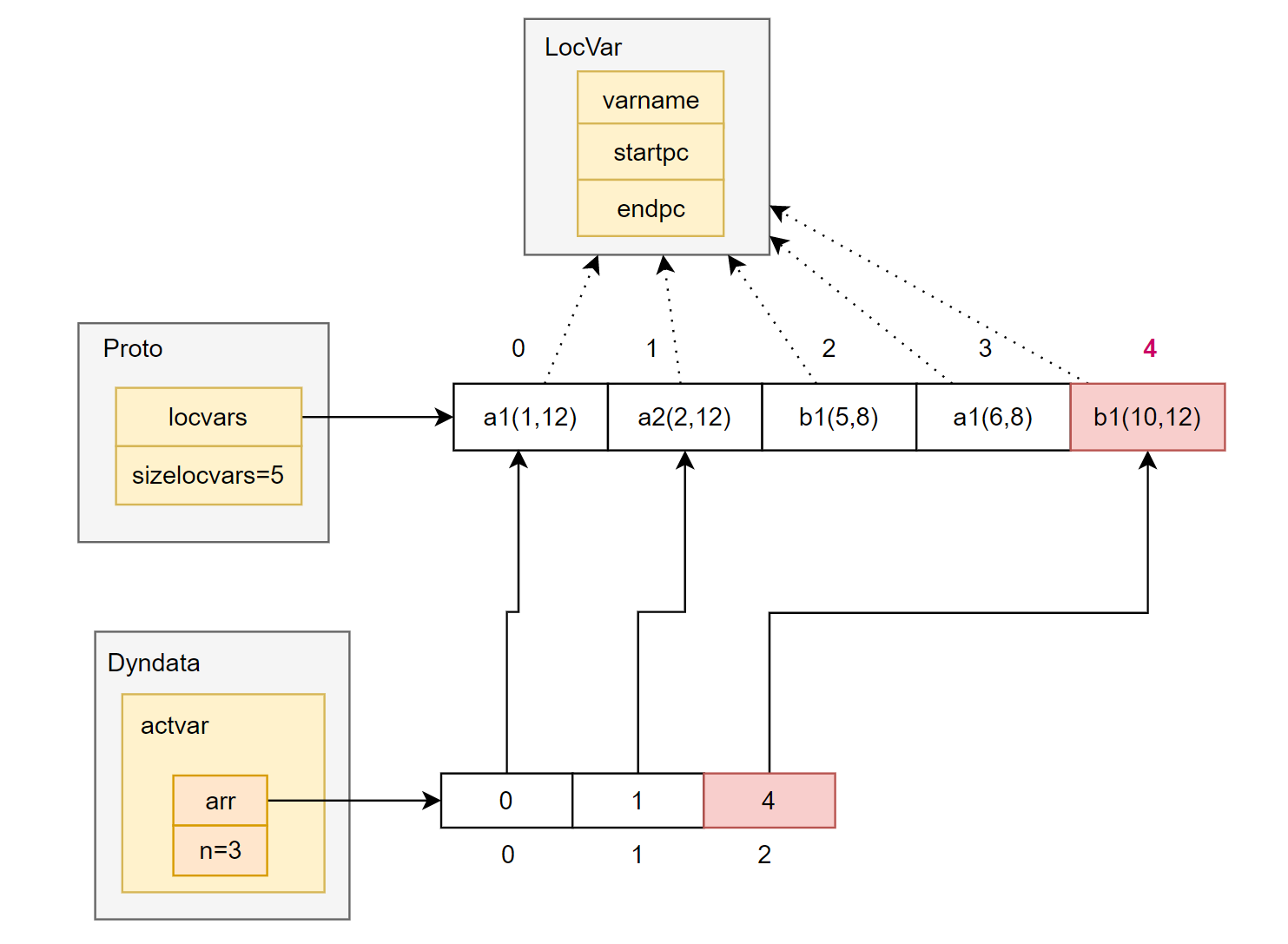 我们可以看到,第 10 行,定义的 b1 局部变量,也被 locvars 按顺序存储起来了,但并没有因为退出了 do...end 而覆盖最后的 b1,a1,而 Dyndata->actvar->arr 数组发生了缩小,actvar->n 的个数从4个变成了3个。第3个元素存储的值是4,它其实指向了 locvars 里的下标4。那么解析到第10行后的代码,局部变量就只剩下可范围为1到12 行的 a1, a2,b1,它们在 locvars 对应的下标为 0,1,4。